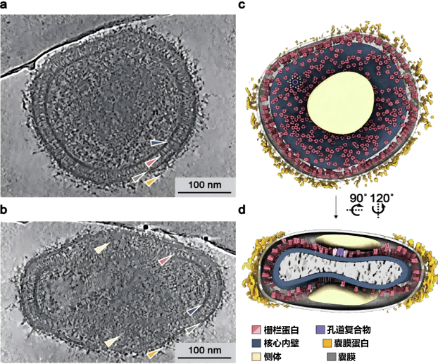 两个“弹药库”(侧体):位于囊膜和双凹形核心之间形成的两个空腔中,装满了能调控宿主细胞的病毒蛋白质。