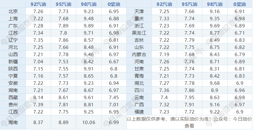 今日油价(2025年8月12日)92号,95号,98号汽油,0号柴油最新油价列表如下: