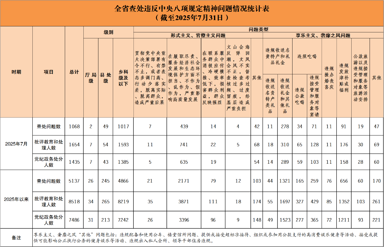 湖南省纪委监委深入贯彻中央纪委国家监委工作部署,在全省各地各部门各单位建立了落实中央八项规定精神情况月报制度。2025年以来,截至7月31日,全省查处违反中央八项规定精神问题情况如下:
