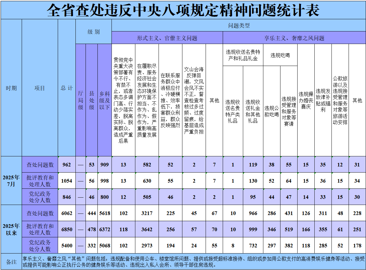 2025年7月,黑龙江省纪检监察机关共查处违反中央八项规定精神问题962起,批评教育和处理1054人,其中党纪政务处分846人。